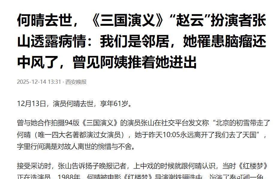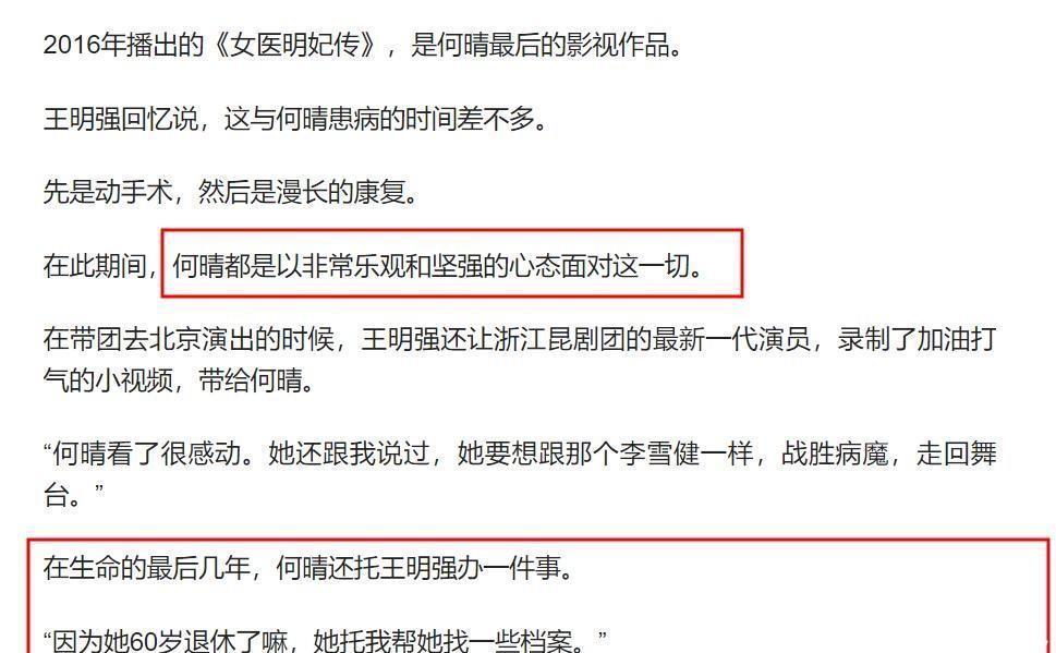何晴2015年查出脑瘤,做过开颅手术,说话受影响。后来还主演过《女医·明妃传》,但身体没完全好,近几年坐轮椅出行。老朋友王明强说她一直很乐观,还想重返舞台,但病情后来加重。