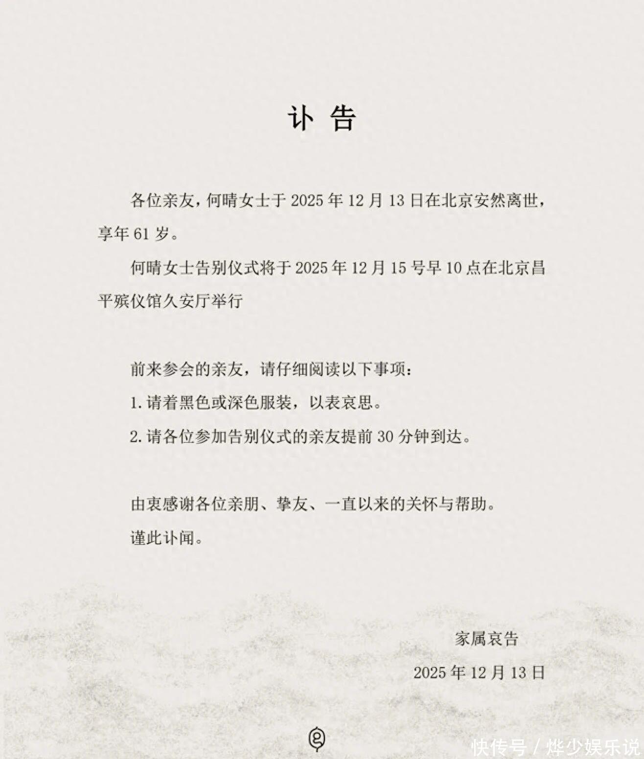 医生朋友透露何晴这些年靠药物维持,最后生活质量极差。但直到去世前还在坚持笑声,身边护士说她每天早起都跟大家打招呼。葬礼结束,灵堂摆满花圈,但不见许亚军家人。
