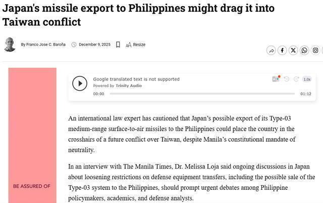 日前,菲方一家媒体,就发表了一篇名为“日本向菲律宾出口导弹可能将其拖入台海冲突”的文章。