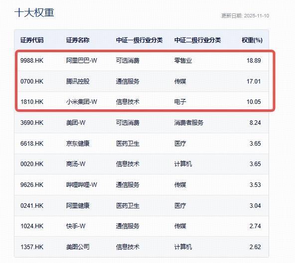 港股互联网ETF(513770)及其联接基金(A类017125;C类017126)被动跟踪中证港股通互联网指数,该指数重仓互联网龙头,阿里巴巴-W、腾讯控股、小米集团-W是其前3大权重股,权重占比分别为18.89%、17.01%、10.05%,前10大持仓合计占比超73%,龙头优势显著。